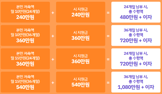 매월 10만 원, 15만 원 중 선택하여 2~3년간 저축하면 동일한 금액으로 시에서 지원금을 매칭하여 적립하여 줍니다. 따라서 만기 시에는 본인 저축액 + 시 매칭 지원금 + 이자까지 수령이 가능합니다.